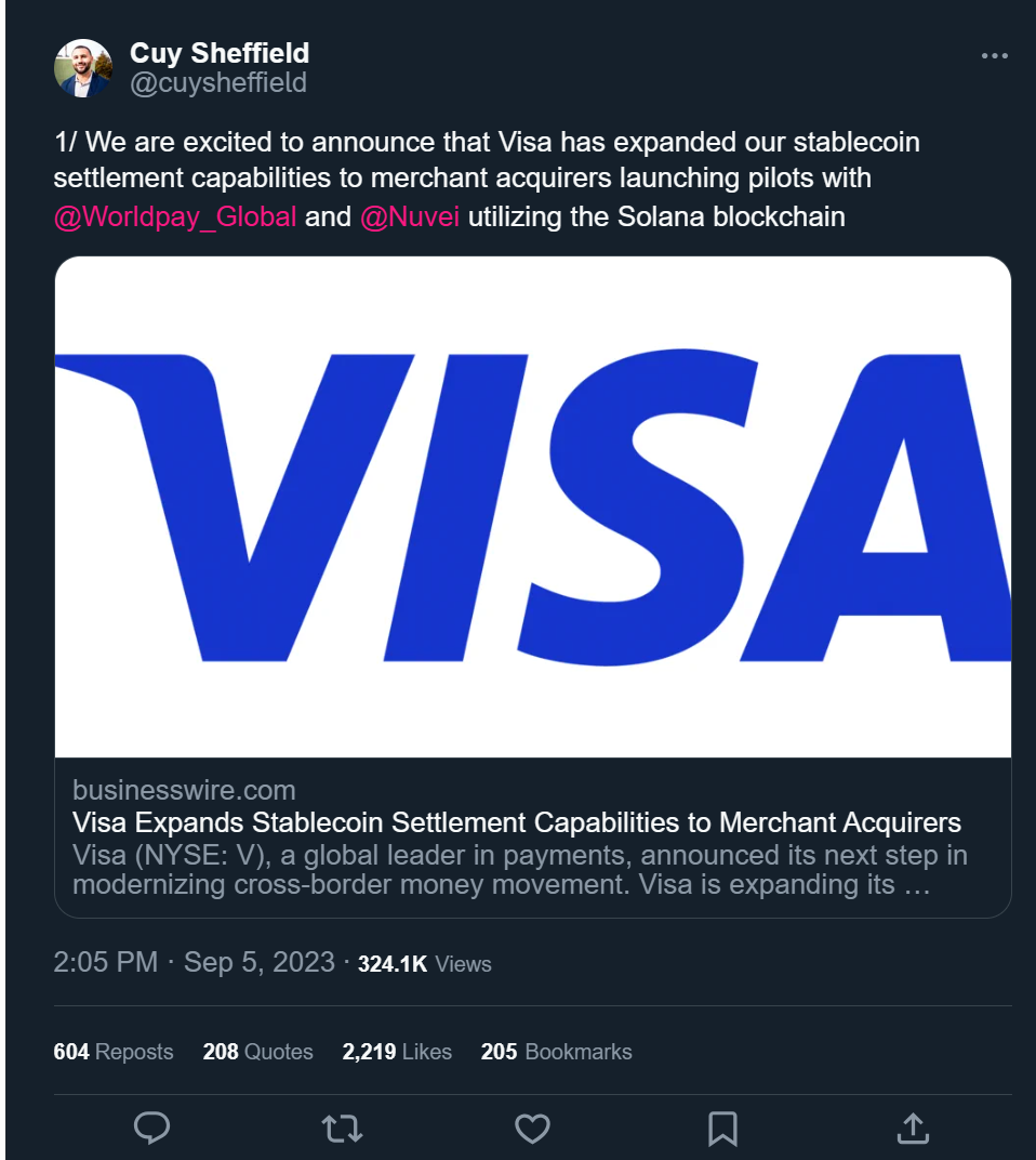 Visa has announced the expansion of its stablecoin settlement capabilities to Solana. Cuy Sheffield, Visa's Head of Crypto, clarifies in his thread the details and implications of this development.
