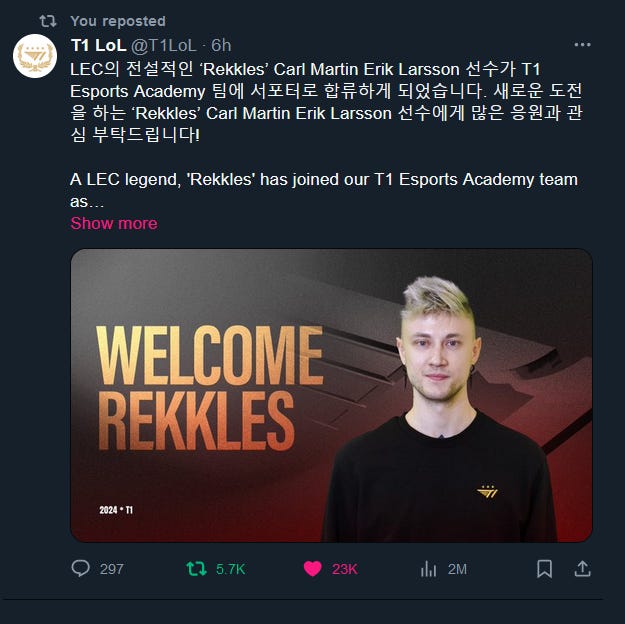 After a year of not playing, the Swede is joining the sister team of the world's top organization. It will be interesting to see the results, primarily because of the language barrier, but also because Rekkles is known for his strong work ethic. I'm curious to see how that compares to that of the Koreans.