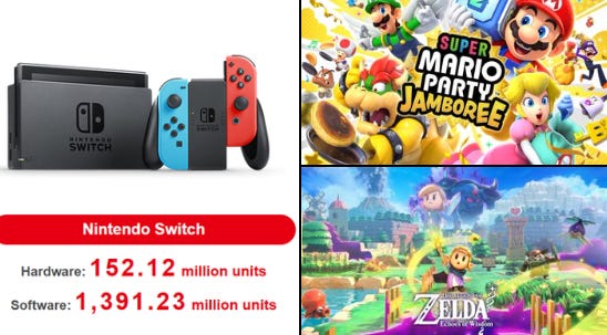 Nintendo's latest financial results show the Switch has sold 152.12 million units, up by 1.26 million, with total software sales reaching 1.39 billion units. Notable game sales include Super Mario Party Jamboree at 7.48 million, Zelda: Echoes of Wisdom at 4.09 million, Donkey Kong Country Returns HD at 1.27 million, and Mario Kart 8 Deluxe leading with 68.2 million copies sold.