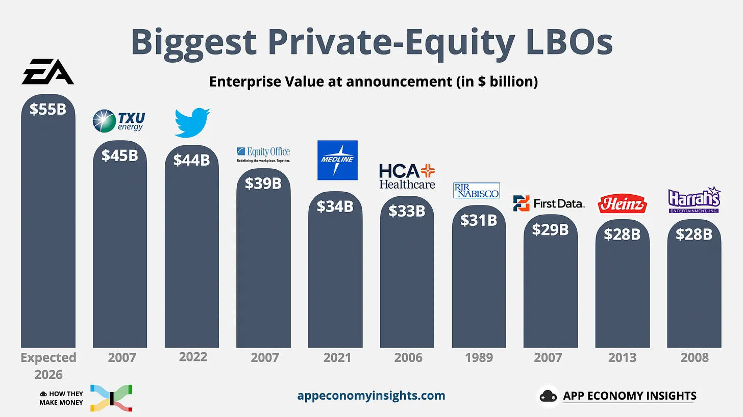 Electronic Arts has agreed to go private in a $55 billion leveraged buyout led by Silver Lake, Saudi Arabia’s Public Investment Fund, and Jared Kushner’s Affinity Partners, making it the largest LBO in history. The deal values EA at $210 per share (a 25% premium) and is structured with roughly $36 billion in equity and $20 billion in debt, with closing targeted for EA’s fiscal Q1 2027. EA’s attractiveness as an LBO target stems from its predictable recurring revenue from live-service games, such as Ultimate Team and Apex Legends, which now comprise 73% of overall revenue, combined with strong free cash flow margins of approximately 25%. The new ownership structure requires a mandatory US foreign investment review due to Saudi Arabia’s involvement, and the company’s success will depend on maintaining license renewals, retaining talent, and generating sufficient cash flow to service the significant debt obligations.