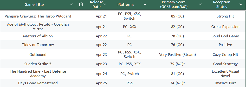 Windrose sold 1 million copies and reached 222,134 peak concurrent Steam users on April 19 also topping Steam charts. (GameSpot)