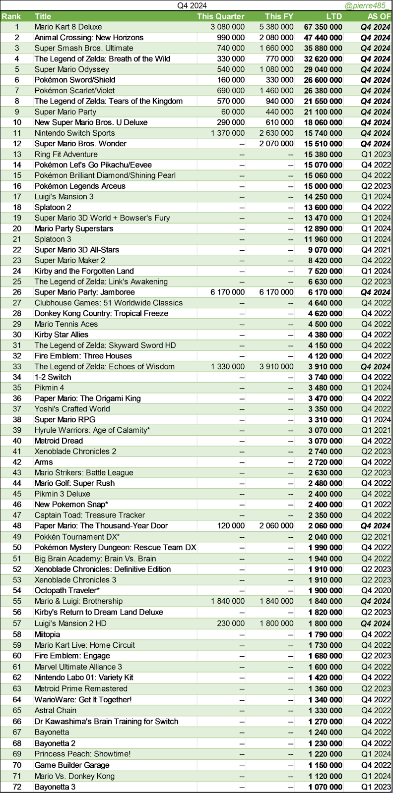 Switch has 72 1st party games that have sold over 1 million units worldwide! - Genki Twitter