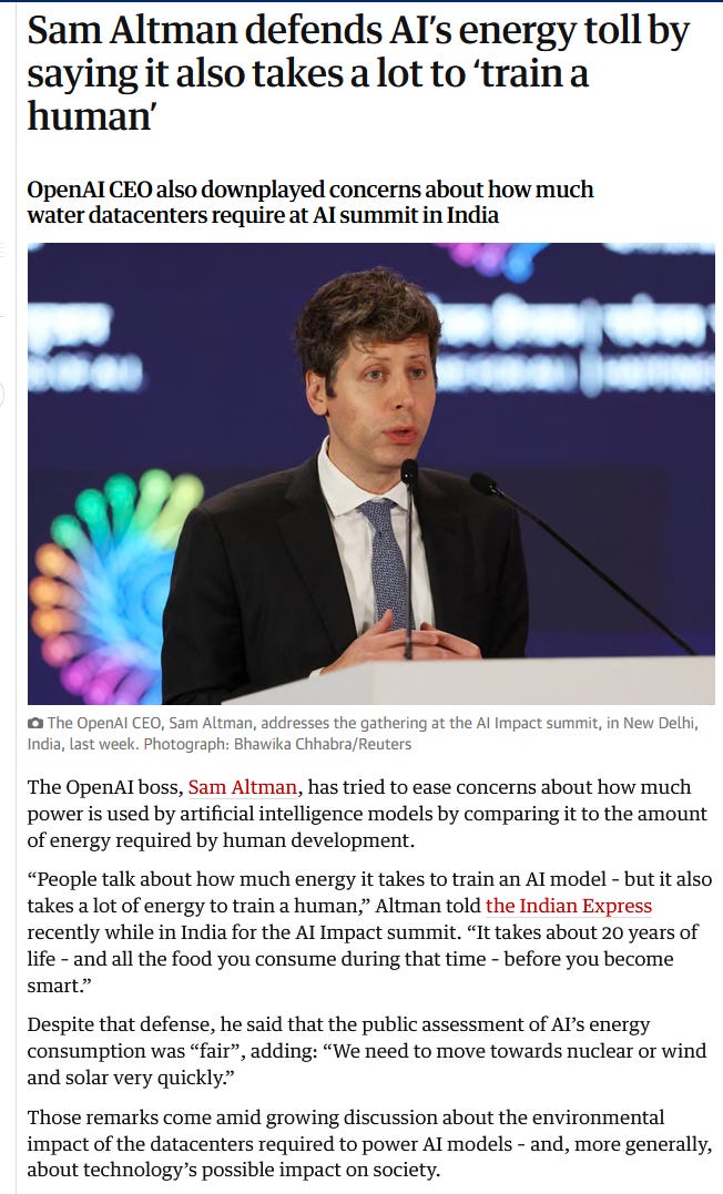 Sam Altman’s recent behaviour: his BG2 interview, where he basically told early investors they could sell their shares if they weren’t happy, his salty response to the Claude ads, and now this new meme‑worthy - but very revealing - line about AI’s energy consumption.